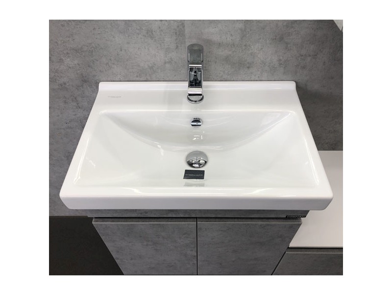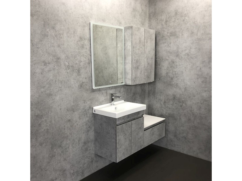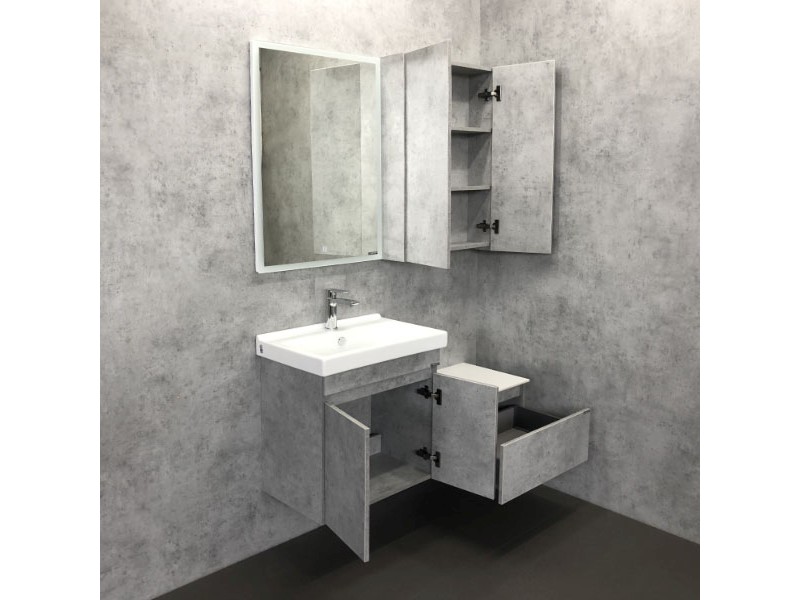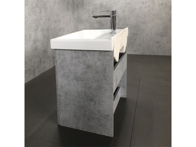 Подвесная тумба-умывальник с двумя распашными дверцами. Створки оборудованы петлями с механизмами плавного закрывания. Корпус и фасады из влагостойкого ЛДСП с декором "бетон светлый". Тумба укомплектована керамической раковиной и подготовлена к подключению коммуникаций из стены и из пола.