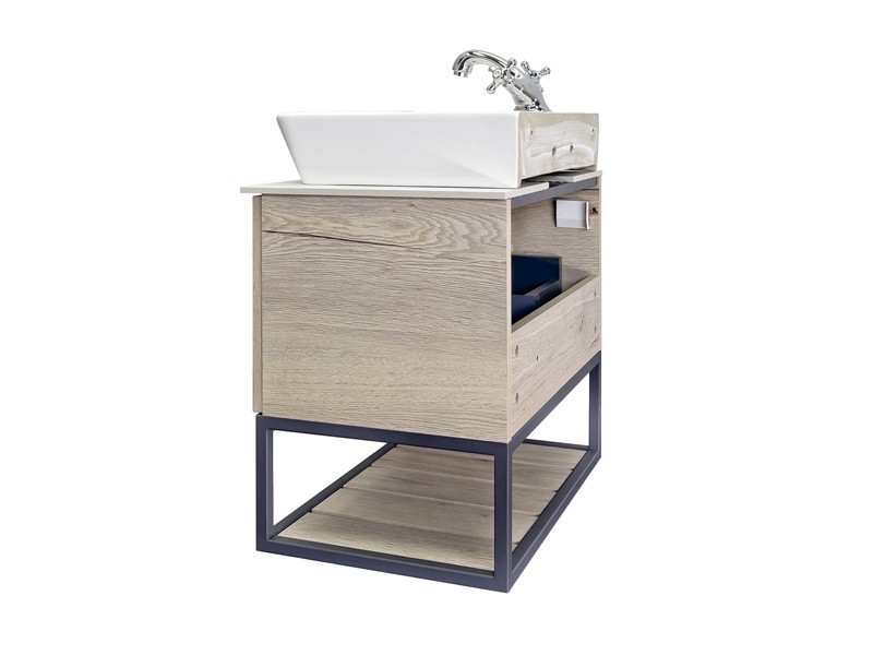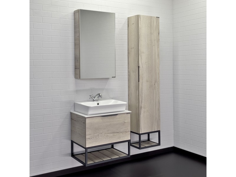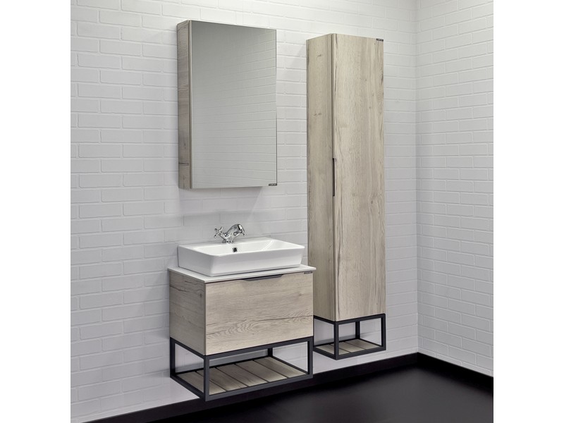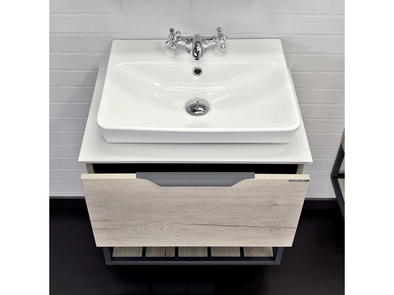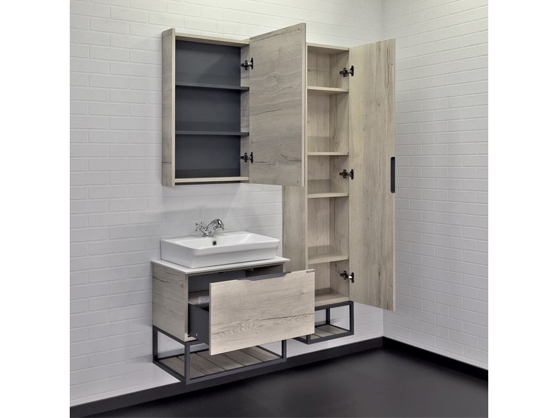Подвесная тумба-умывальник в стиле лофт Порто 60 с одним выдвижным ящиком оснащенным системой плавного закрывания и нижней полкой открытого хранения для полотенец. В основе тумбы - каркас из стального профиля окрашенный в цвет серый графит.
