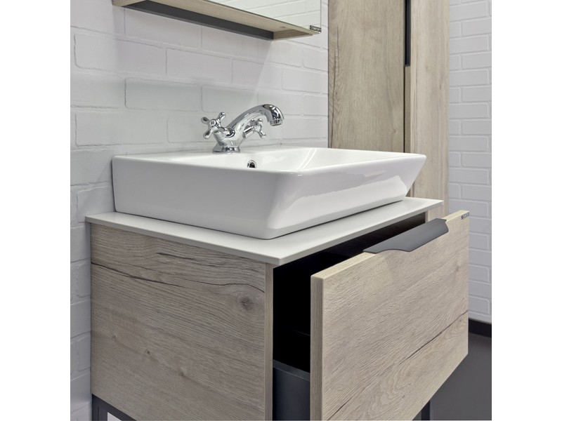 Комплектация: накладная прямоугольная раковина Comforty 9055RA-50, столешница из белого керамогранита. Тумба подготовлена для подключения водоснабжения снизу.