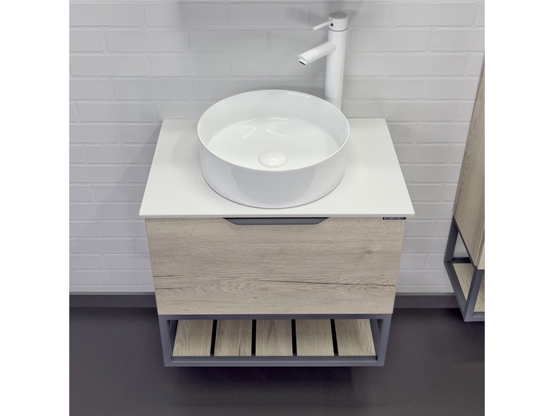 Комплектация: накладная круглая раковина Comforty 9111, столешница из белого керамогранита. Тумба подготовлена для подключения водоснабжения снизу.