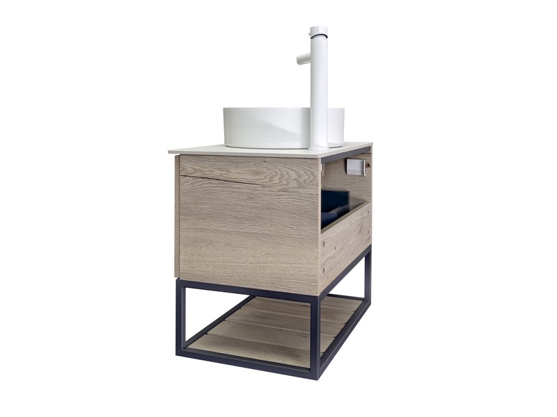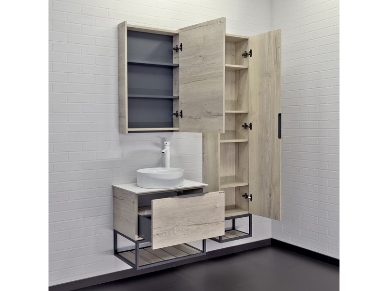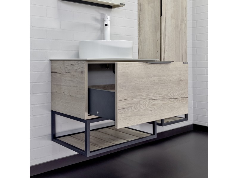 Подвесная тумба-умывальник в стиле лофт Порто 60 с одним выдвижным ящиком оснащенным системой плавного закрывания и нижней полкой открытого хранения для полотенец. В основе тумбы - каркас из стального профиля окрашенный в цвет серый графит.
