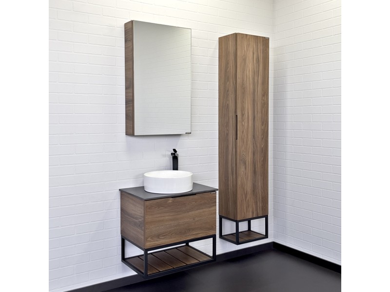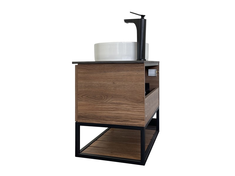 Подвесная тумба-умывальник в стиле лофт Порто 60 с одним выдвижным ящиком оснащенным системой плавного закрывания и нижней полкой открытого хранения для полотенец. В основе тумбы - каркас из стального профиля окрашенный в черный цвет.