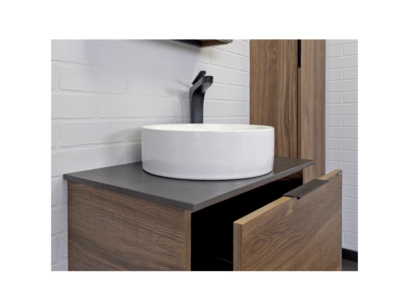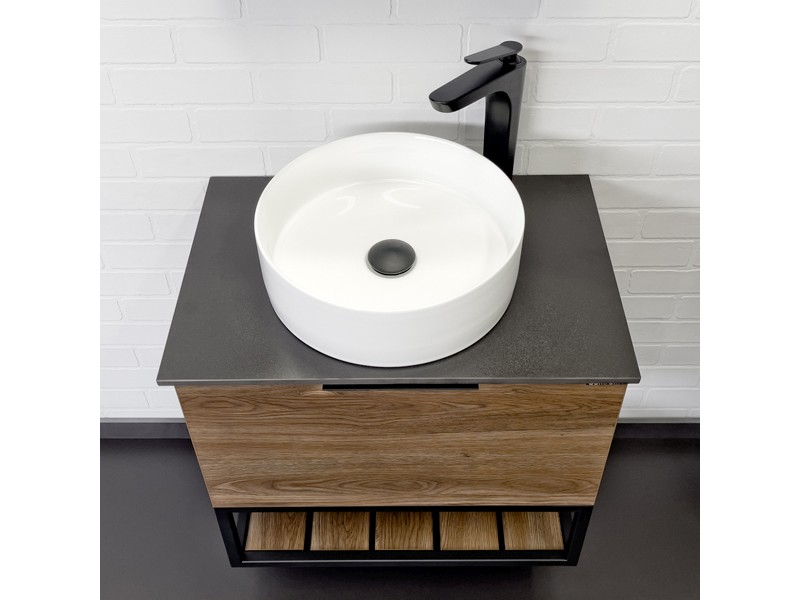 Комплектация: накладная круглая раковина Comforty 9111, столешница из черного керамогранита. Тумба подготовлена для подключения водоснабжения снизу.