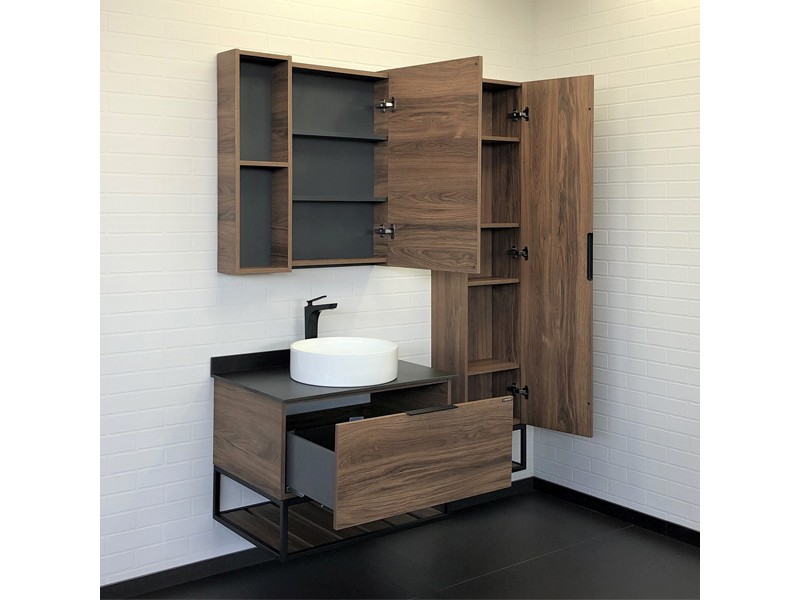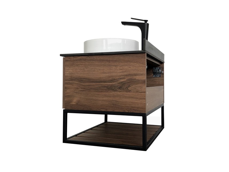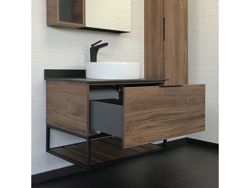 Подвесная тумба-умывальник в стиле лофт Порто 75 с одним широким ящиком оснащенным системой плавного закрывания и нижней полкой открытого хранения для полотенец. В основе тумбы - каркас из стального профиля окрашенный в черный цвет.