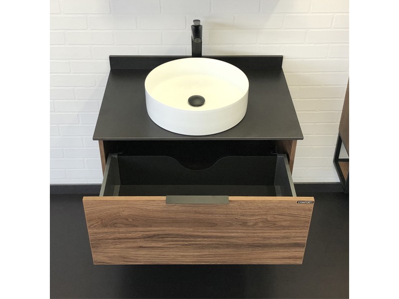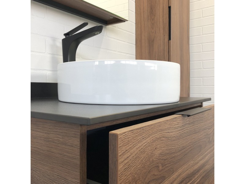 Комплектация: накладная круглая раковина Comforty 9110, столешница и пристенный бортик из черного керамогранита. Тумба подготовлена для подключения водоснабжения снизу.