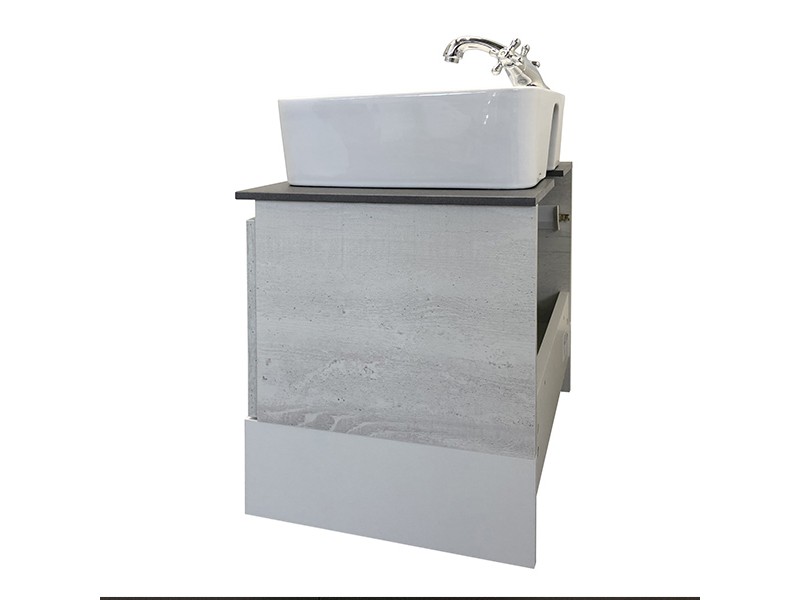 Тумба-умывальник в современном стиле выкатным ящиком и пространством для открытого хранения. Ящик оснащен направляющими с системой плавного закрывания. Тумба укомплектована столешницей и плинтусом из керамогранита цвета антрацит, а также накладной прямоугольной раковиной.