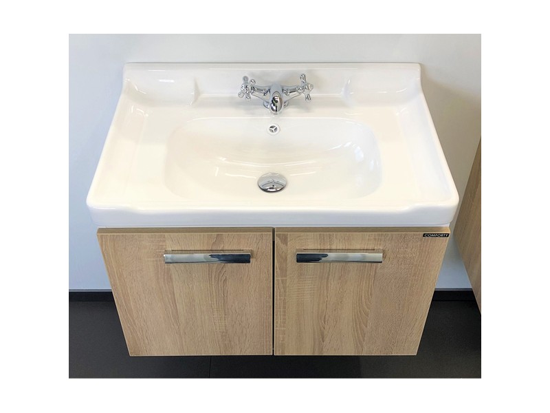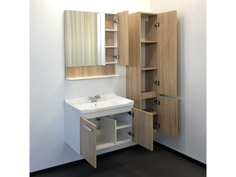 Подвесная тумба-умывальник шириной 70 см в современном стиле с двумя распашными створками для хранения принадлежностей для умывания и бытовой химии. Петли створок оснащены механизмами плавного закрывания. Фасады и корпус из влагостойкого ЛДСП. Корпус из ДСП белого цвета, фасады - дуб сонома.
