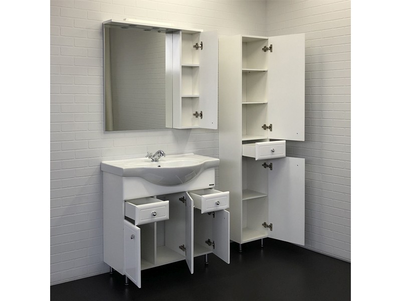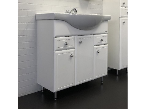 Тумба-умывальник в классическом стиле с тремя створками и двумя выдвижными ящиками. Створки оснащены петлями с плавным закрыванием. Фасады и боковины тумбы покрыты белой глянцевой эмалью. Тумба укомплектована широкой и глубокой раковиной Сантек Сенеж 87