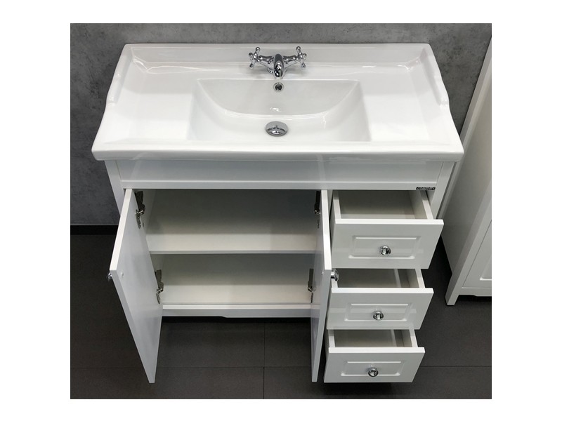 Тумба-умывальник в традиционном стиле с двумя створками и тремя ящиками. Створки оснащены петлями с плавным закрыванием. Фасады тумбы из МДФ покрыты белой глянцевой эмалью. Тумба укомплектована оригинальной прямоугольной раковиной с бортиком по периметру.