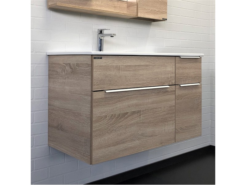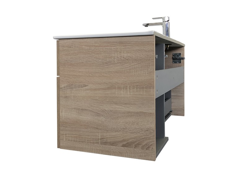Подвесная тумба с одним большим, одним малым выкатными ящиками и малой створкой оборудованными системами плавного закрывания. Корпус и фасад тумбы изготовлены из влагостойкого ДСП, созданного по уникальной технологии «Синхронное тиснение» в декоре «дуб сонома».