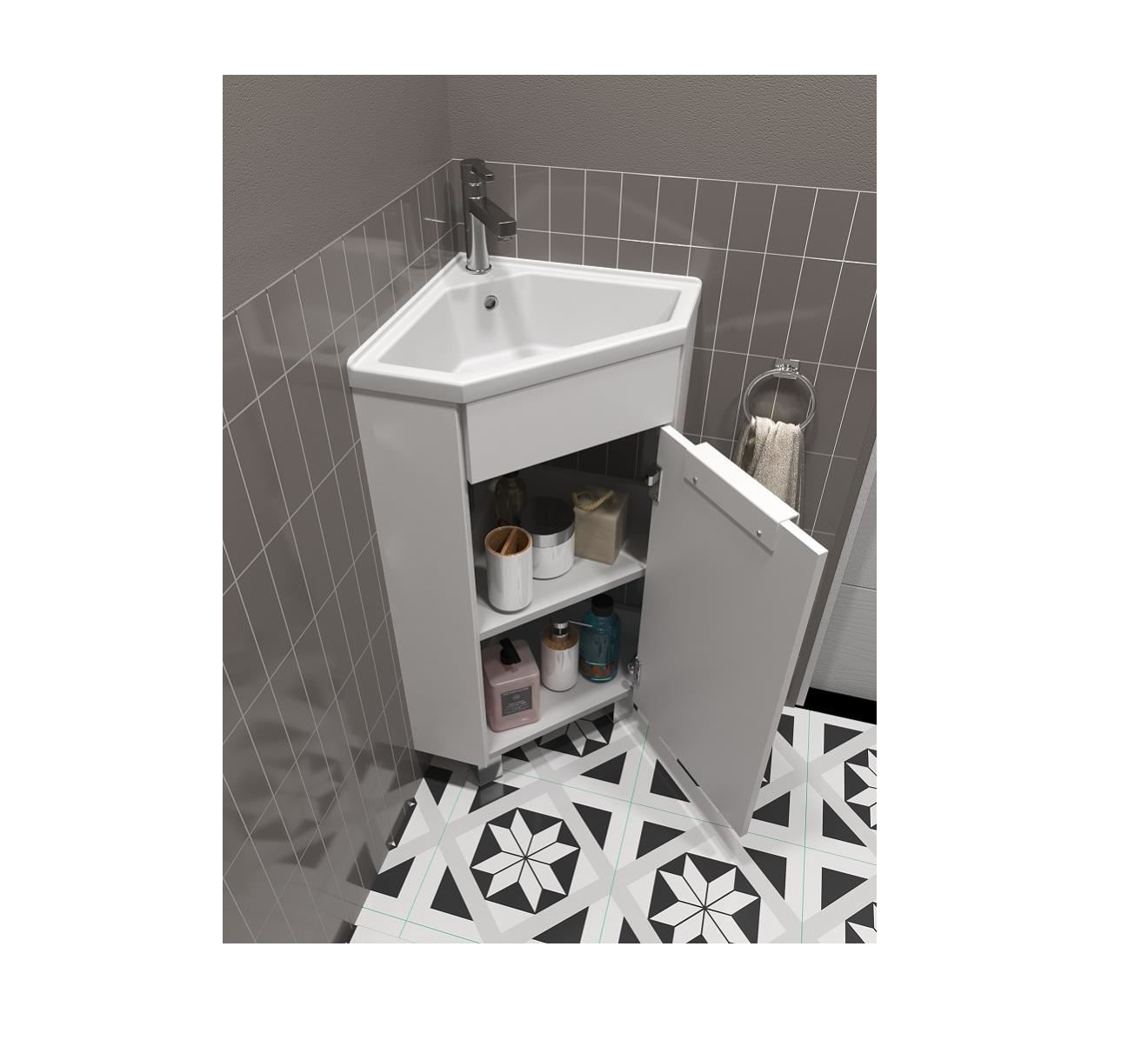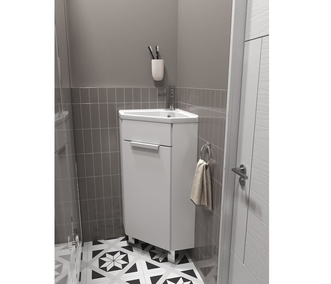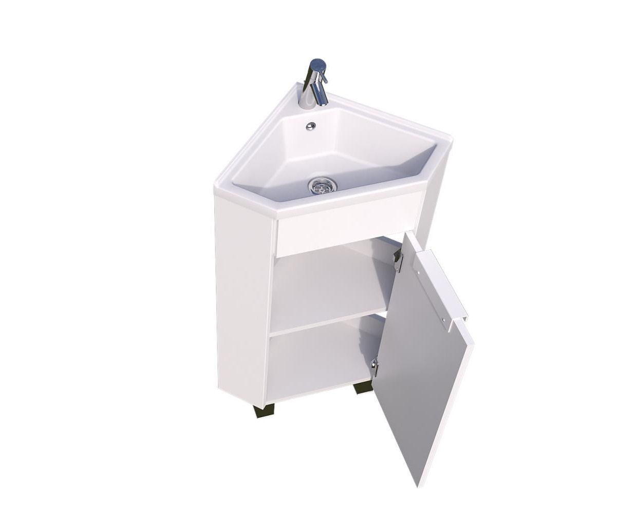 Компактная угловая тумба «MarkaOne» Penta 37x37 в комплекте с пятиугольной с раковиной выполнена в современном минималистичном стиле, для которого характерны рациональность и эргономичность. Корпус из ЛДСП и фасады из МДФ устойчивы к влаге.