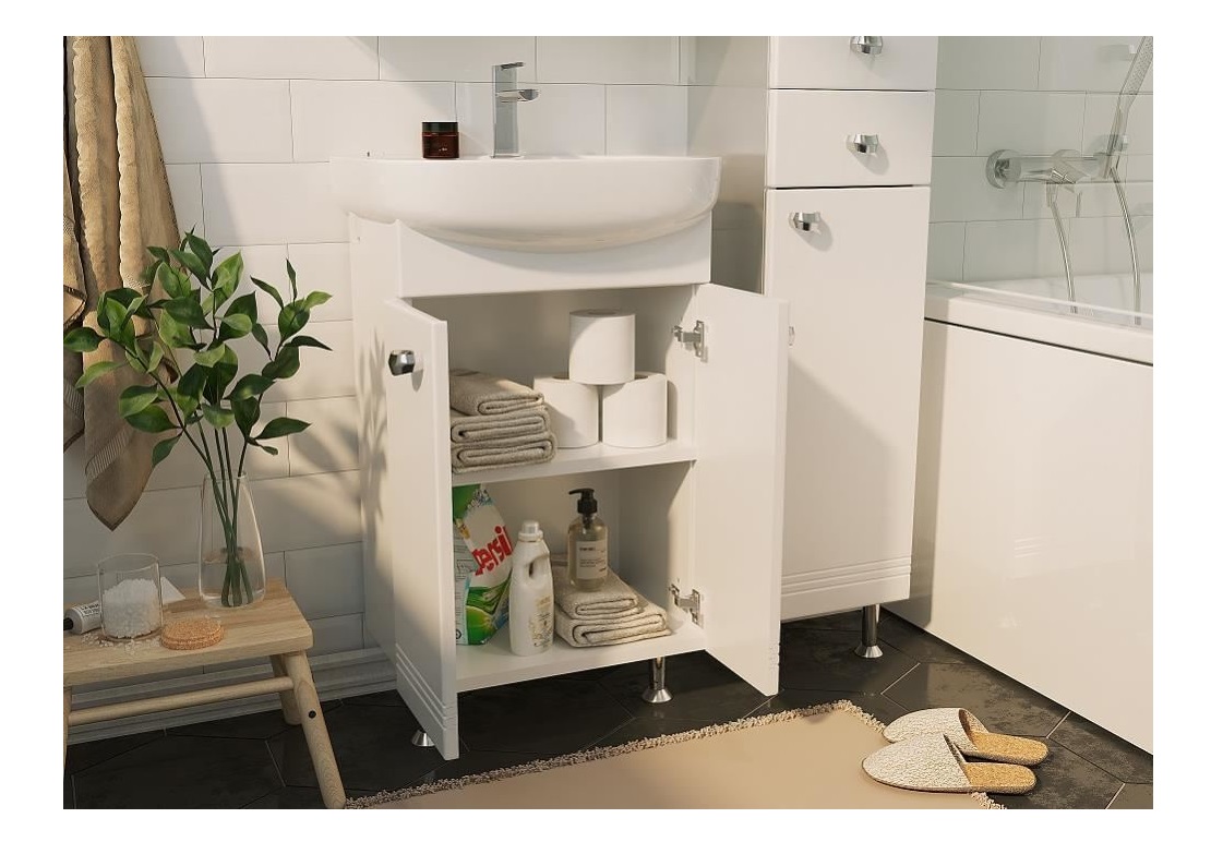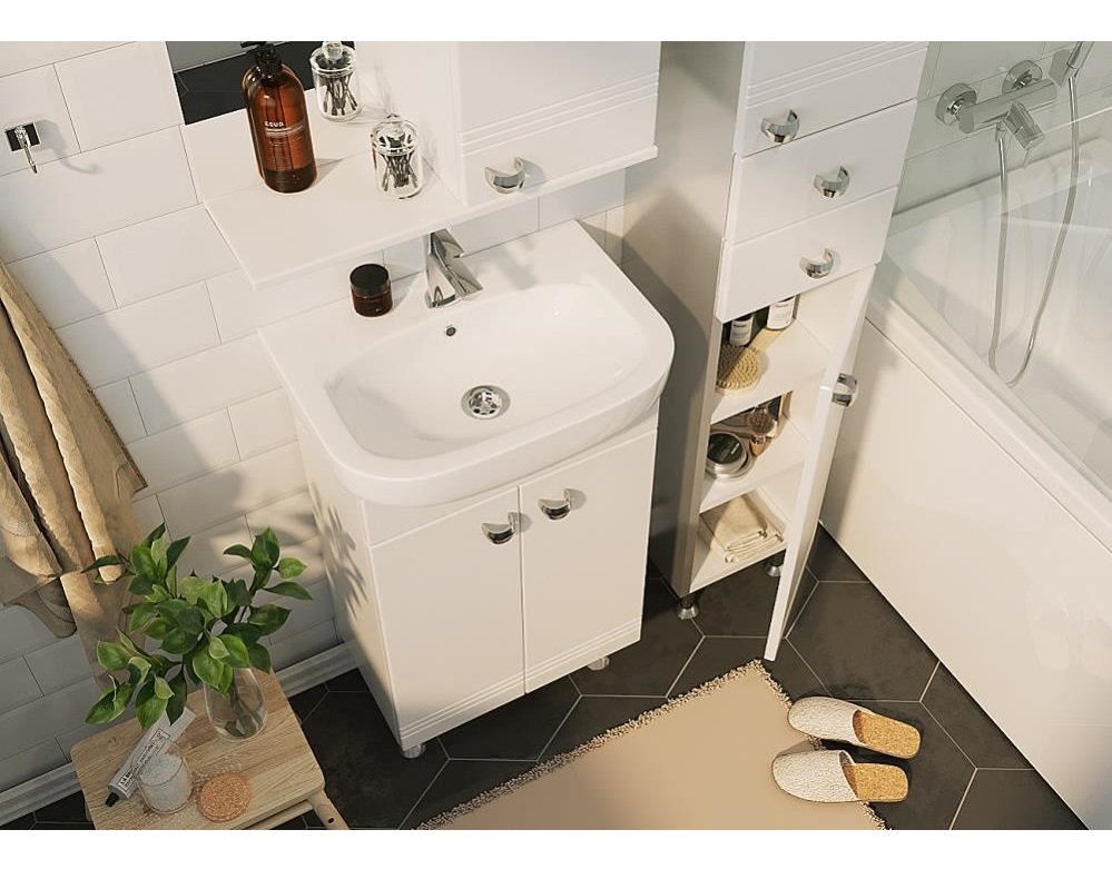 Тумба Story предназначена для небольших ванных комнат. Корпус, выполненный из влагостойкой ЛДСП, и фасады из МДФ покрыты ПВХ пленкой с высокой степенью глянца.