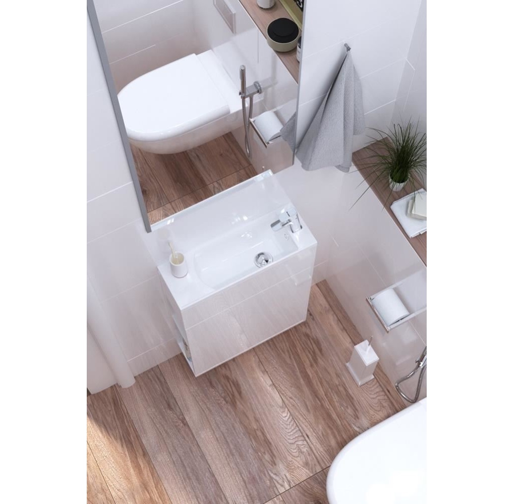 Знаете ли вы, что проблема тесного санузла далеко не в дефиците площади? Все дело в неудачном выборе обстановки или неправильной организации пространства. Stretto – синоним компактности. А тумба с раковиной 1Marka Stretto 50П белый глянец R – образец миниатюрной мебели. Раковина позволяет соблюсти правила гигиены, а тумба обеспечивает систему хранения необходимых вещей.