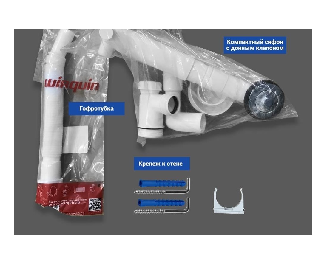 - В тумбу с раковиной предустановлен телескопический компактный сифон, гофрированная трубка, выпуск и донный клапан