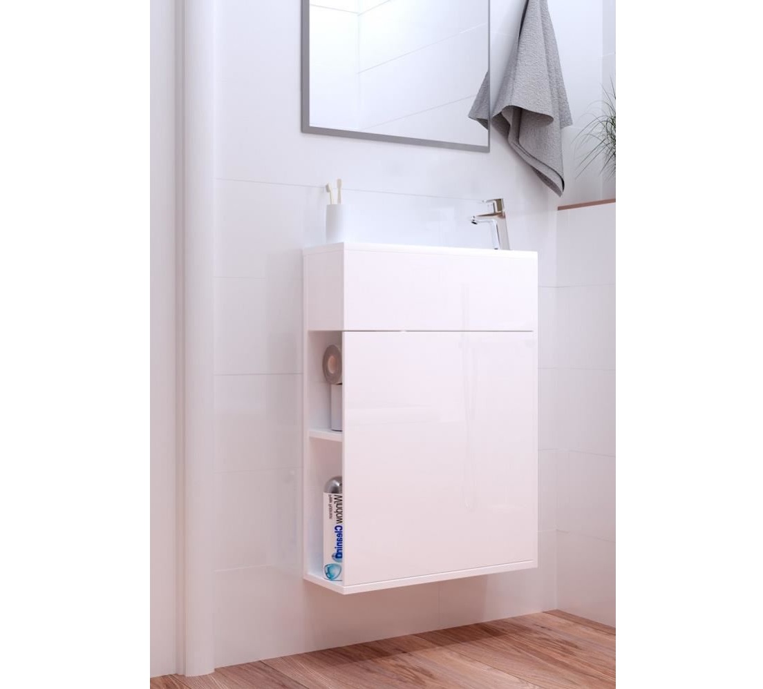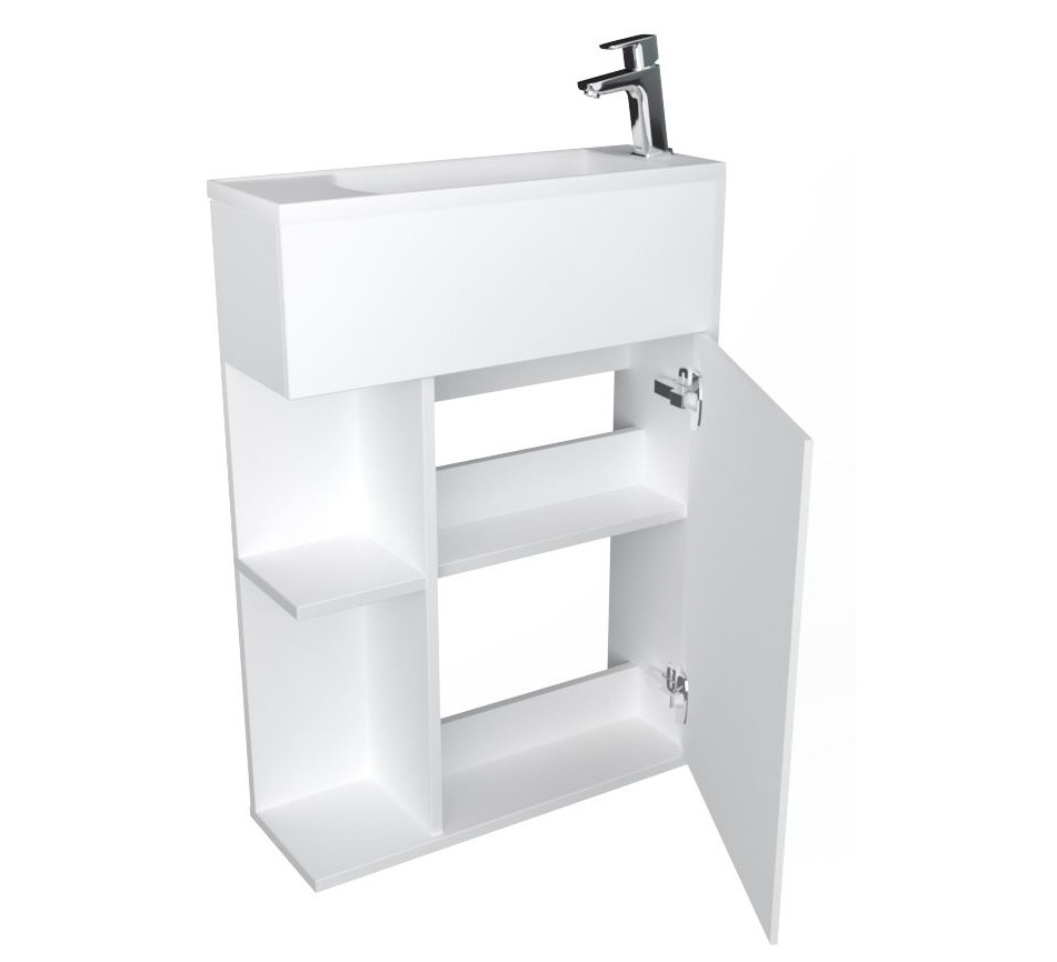 Тумба с полкой за распашной дверцей. Минималистичный дизайн без ручек: открывание от захвата. Петли на дверце с доводчиками. Кроме закрытого отделения, есть открытая полка с доступом сбоку. Подойдет для частоиспользуемых принадлежностей. Тумба подвесная, крепится на стальные навесы. Изделие функционально и надежно. Достойный выбор для гостевого санузла в частном доме, подойдет для бизнеса: отеля или ресторана.