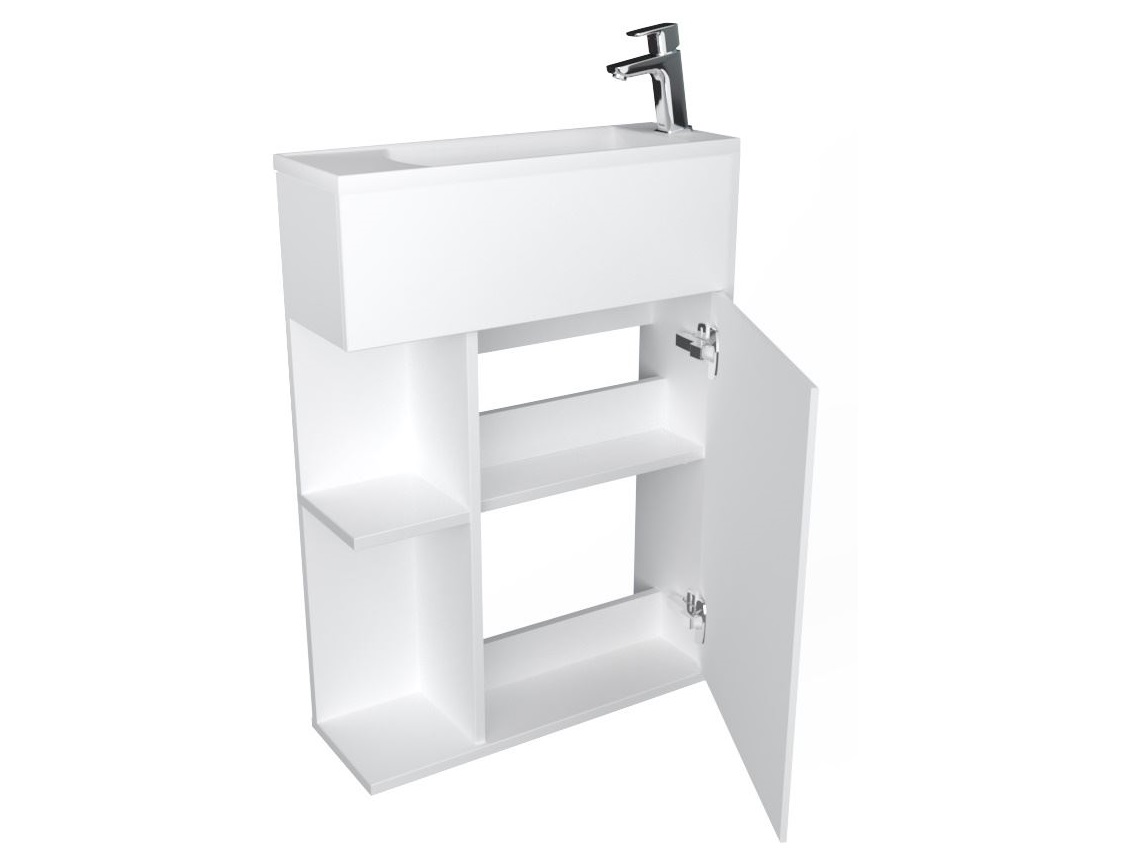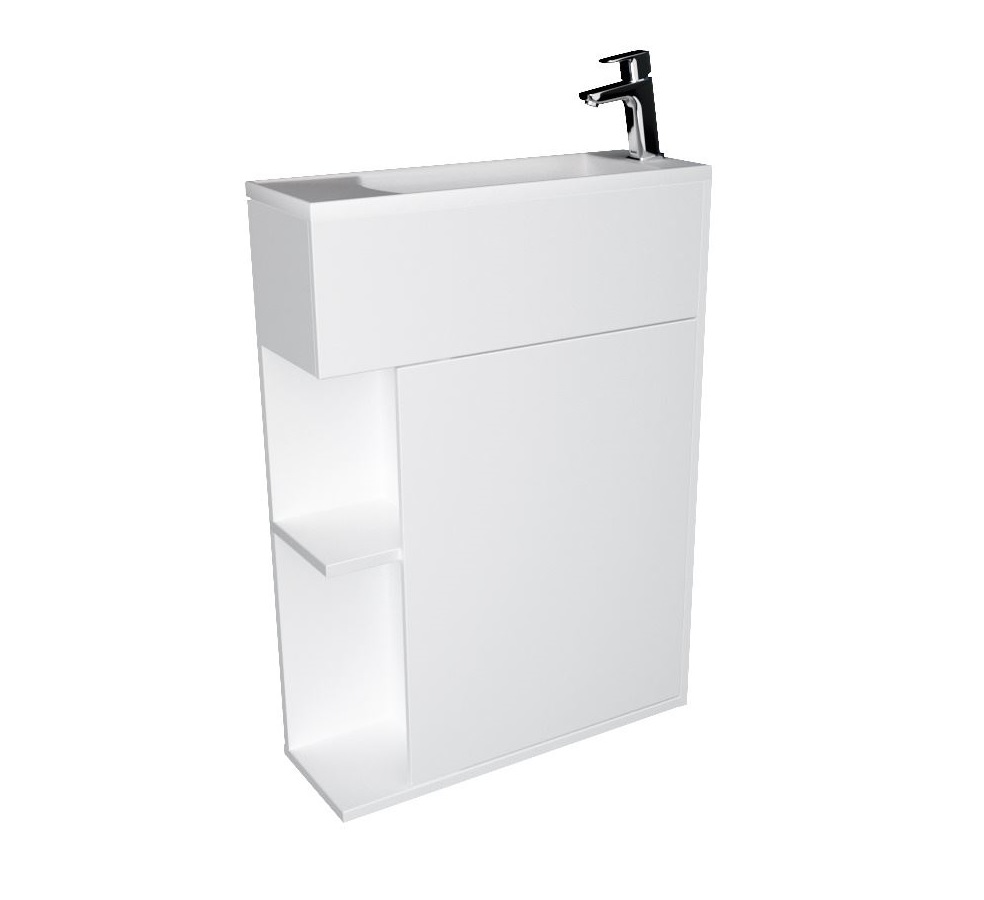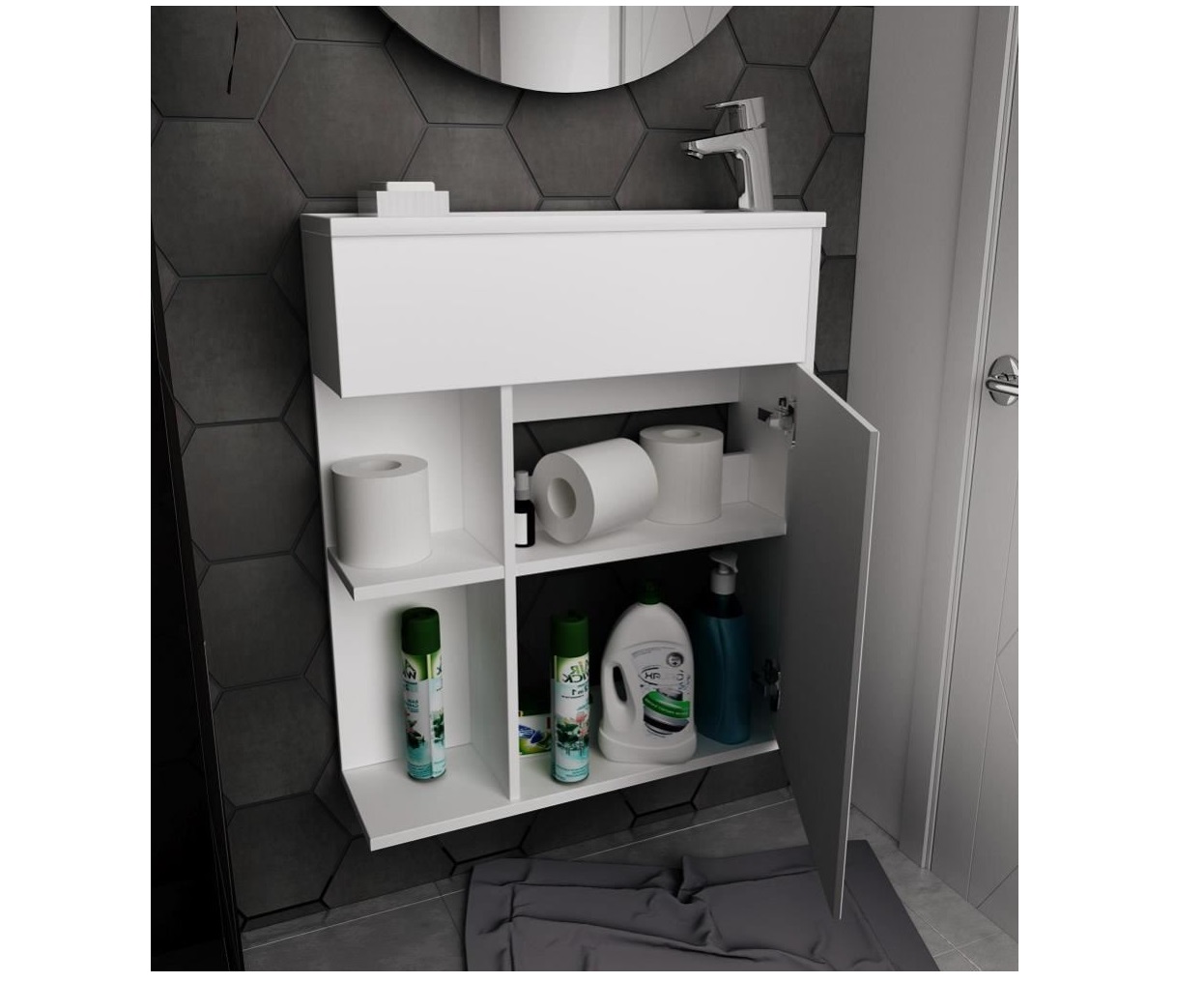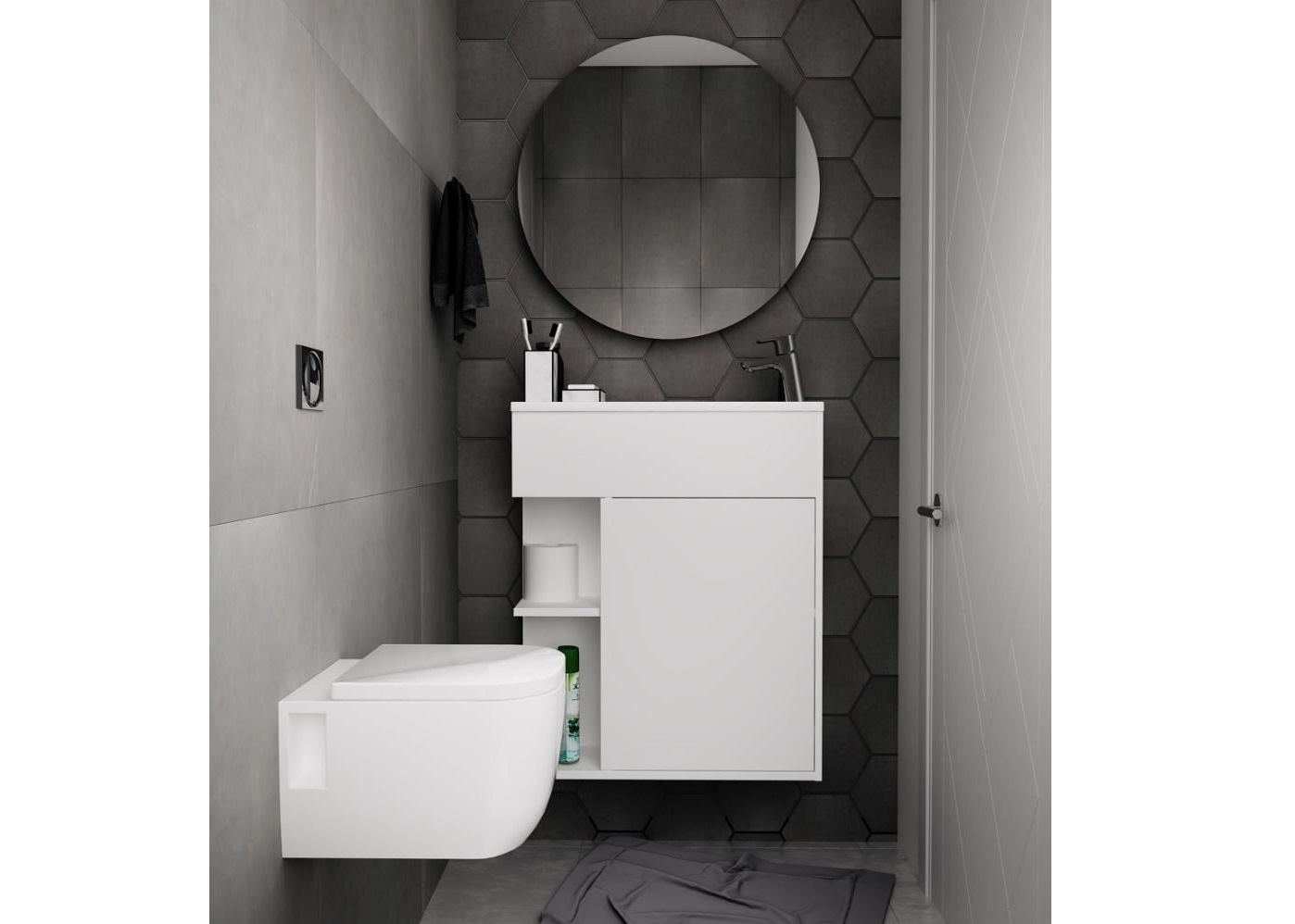 Тумба с полкой за распашной дверцей. Минималистичный дизайн без ручек: открывание от захвата. Петли на дверце с доводчиками. Кроме закрытого отделения, есть открытая полка для часто используемых принадлежностей. Тумба подвесная, крепится на стальные навесы. Изделие функционально и надежно. Достойный выбор для гостевого санузла в частном доме, подойдет для бизнеса: отеля или ресторана.