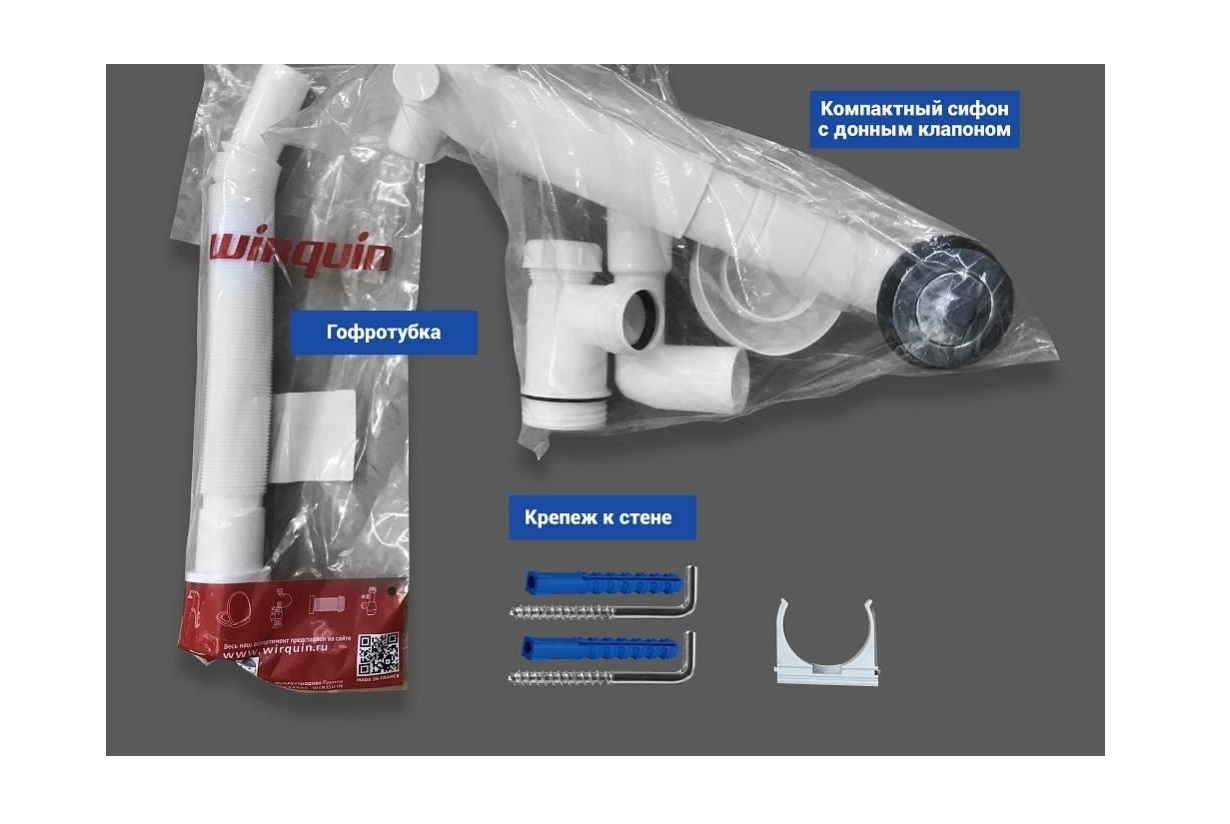 - В тумбу с раковиной предустановлен телескопический компактный сифон, гофрированная трубка, выпуск и донный клапан