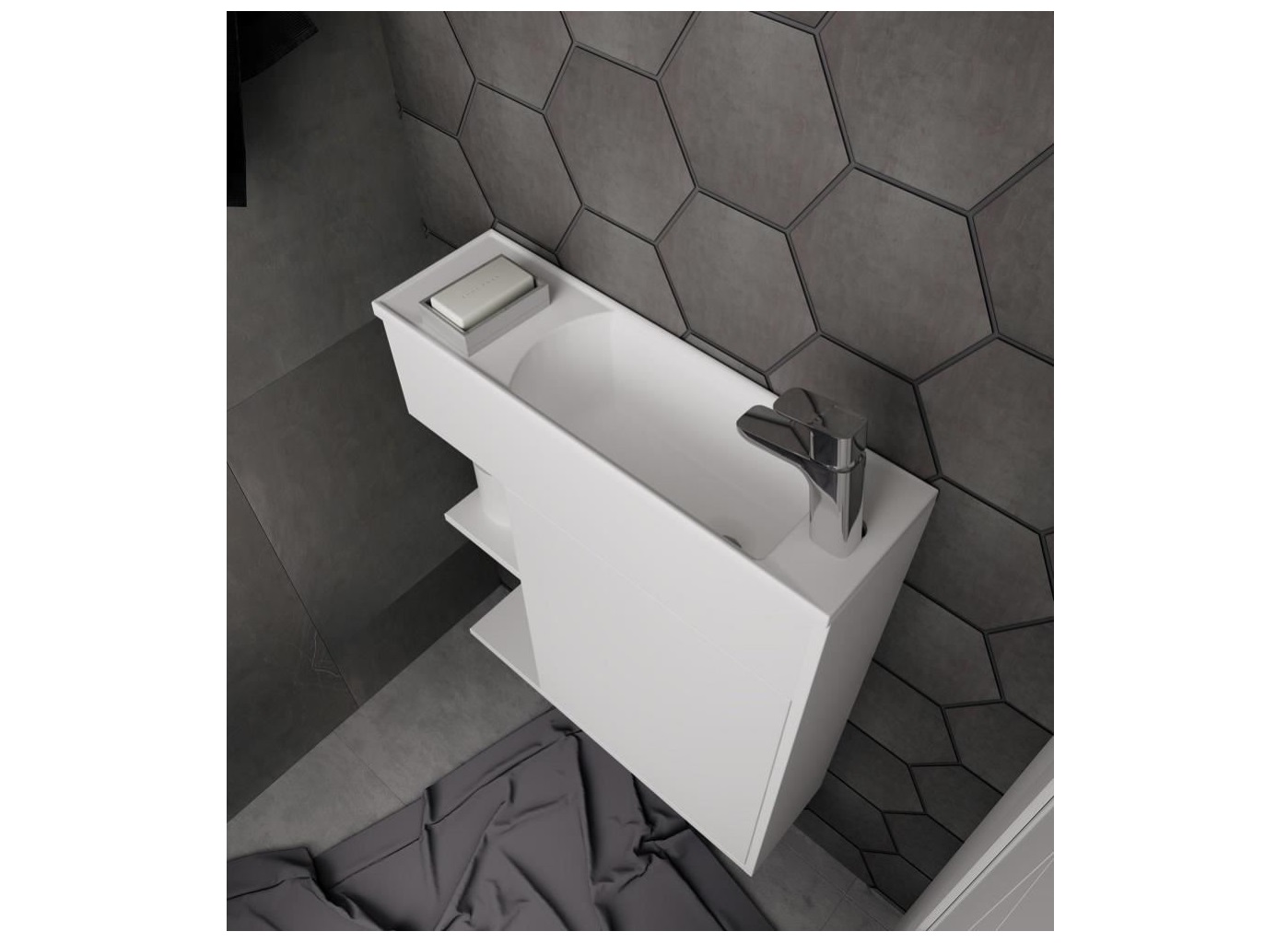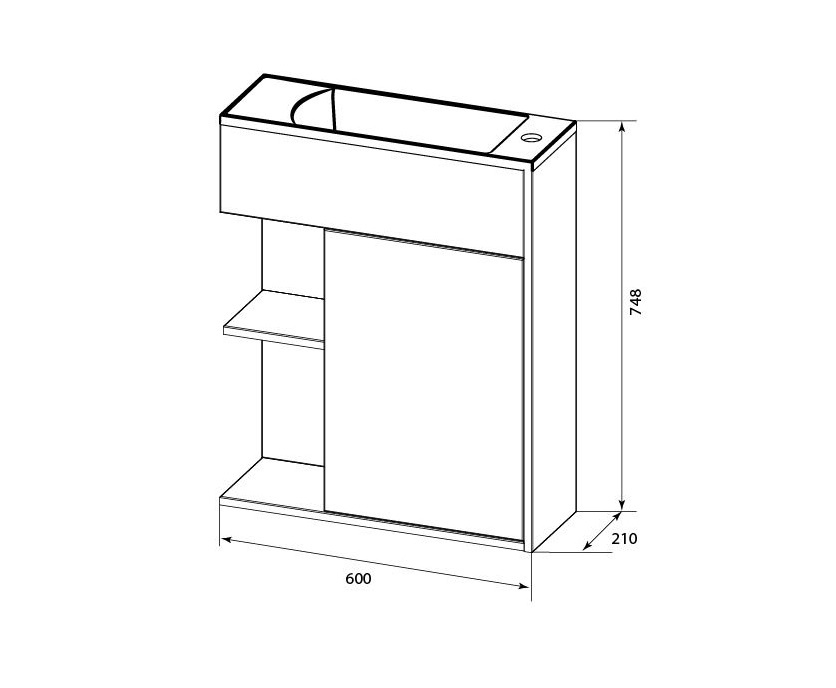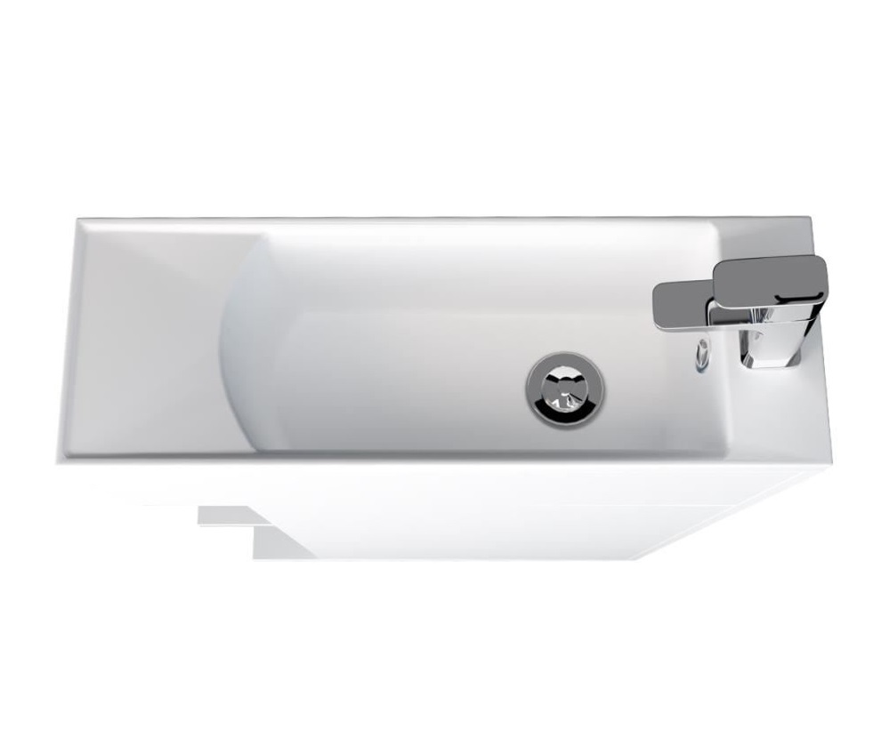 Раковина – предельно узкая, всего 21см. Выполнена из полимерной керамики. Чтобы еще больше сэкономить полезное пространство, края сделаны тонкими, радиус закругления небольшим. Приподнятые грани по периметру обеспечивают эффективный сток воды. Есть небольшая площадка для диспенсера с мылом. На противоположной стороне – отверстие под смеситель. Есть слив-перелив.