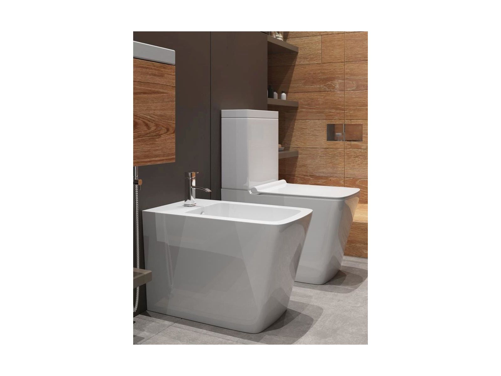 Унитаз напольный SOLI ТК-301 пристенной установки с бачком. Модель имеет антигрязевое покрытие и горизонтальный выпуск.