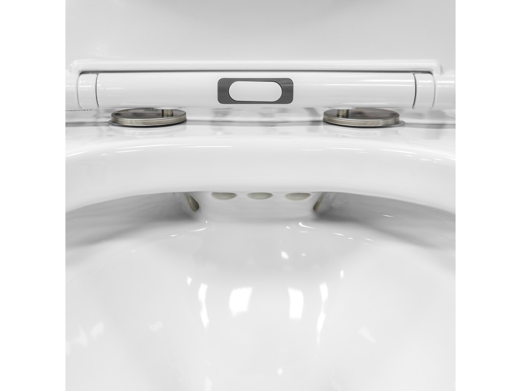 Сиденье: дюропласт с антибактериальным покрытием, с функцией микролифт (soft-close), тонкое (slim), быстросъёмное (clip-up)