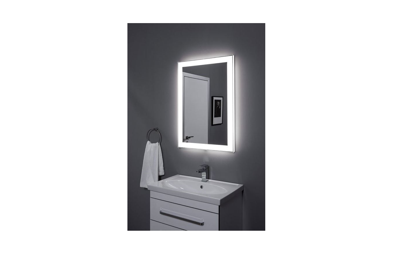 Четкие рельефные формы зеркального полотна размером 120х85, которое по периметру подчеркнуто светодиодной подсветкой, выглядят чрезвычайно эффектно. Чтобы зеркало осветилось спокойным голубоватым светом, необходимо просто провести рукой у инфракрасного датчика, который не бросается в глаза, но расположен очень удобно для пользователя. Такое зеркало отлично впишется в современный интерьер.