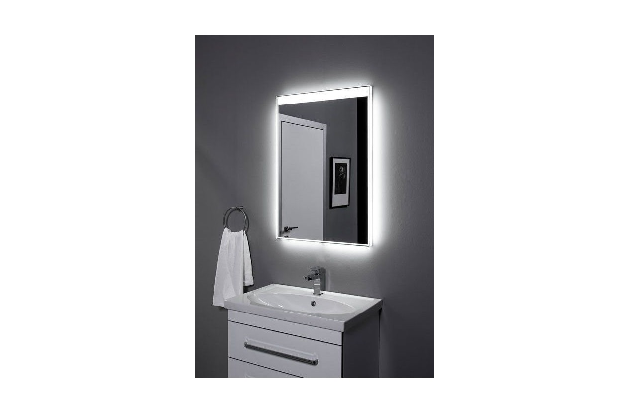 Тоненькая светящаяся полоска по всему периметру этого четырехугольного зеркала – LED-светильник. В верхней части она перетекает в широкую рамку. Зеркало размером 70х85 будет симпатично смотреться в ванной и зрительно увеличит размер маленького помещения. Оно будет выглядеть единым комплектом с тумбой шириной 70 см.