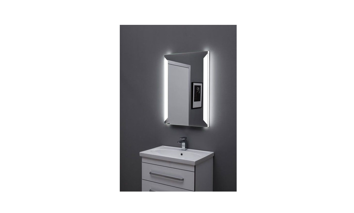 Внутри встроен LED-светильник, при включении которого свет проникает через боковые части конструкции, создавая подсветку как бы изнутри самого изделия и через участки, на которые не нанесено зеркальное покрытие. В результате светильник образует оригинальной формы светящуюся рамочку для зеркала. Она создает в ванной легкую подсветку, которая не режет глаза и излучает приятный свет, и, к тому же, придает самому изделию привлекательный вид.