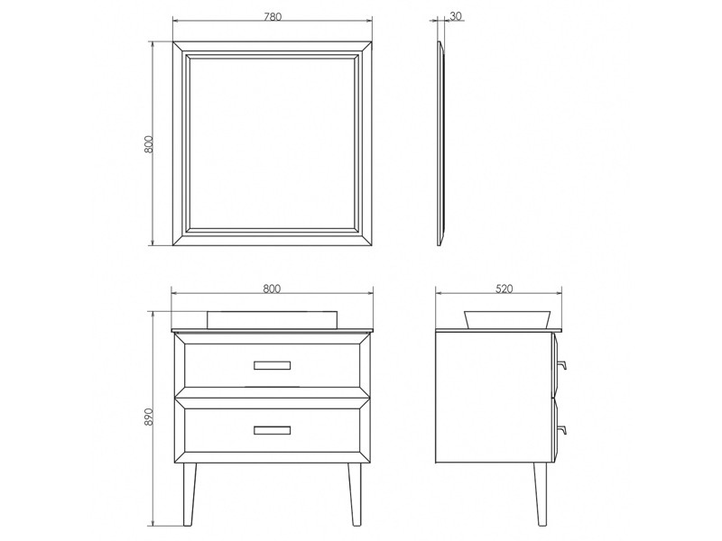Зеркальное высококачественное полотно с амальгамой на основе серебра. Рама из МДФ окрашенного белой глянцевой эмалью. Фацет на зеркальном полотне и раме повторяется на выдвижных ящиках тумбы-умывальника.