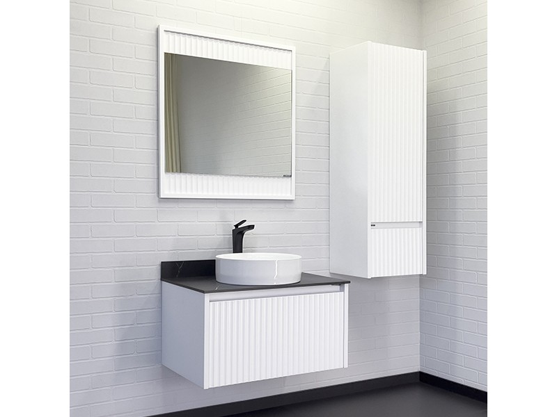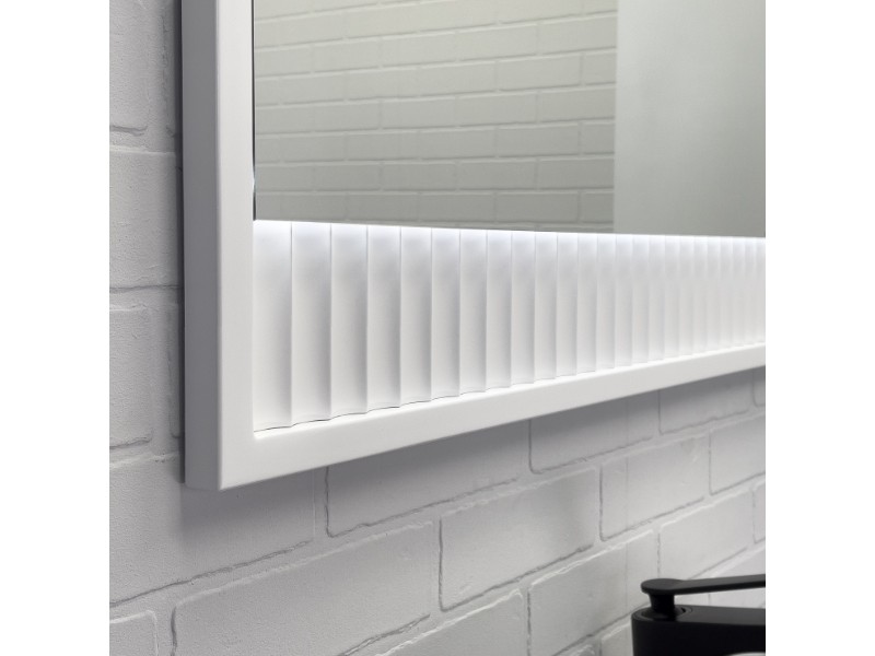 Зеркальное высококачественное полотно с амальгамой на основе серебра. Основа зеркала из МДФ фрезерована геометрическим узором с имитацией волны и окрашена белой матовой эмалью. Зеркало оборудовано светодиодной подсветкой с включением/выключением бесконтактным сенсором.
