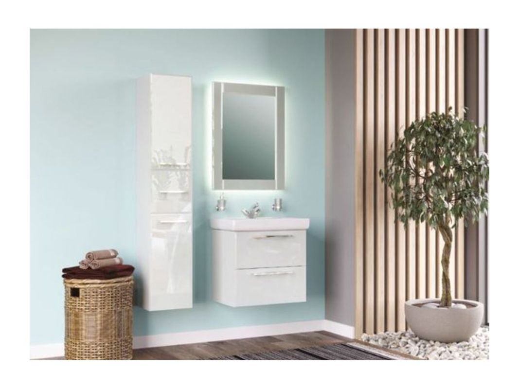 Контур зеркала отражает репродукцию оникса, который идеально впишется в ванную комнату с мебельным комплектном.