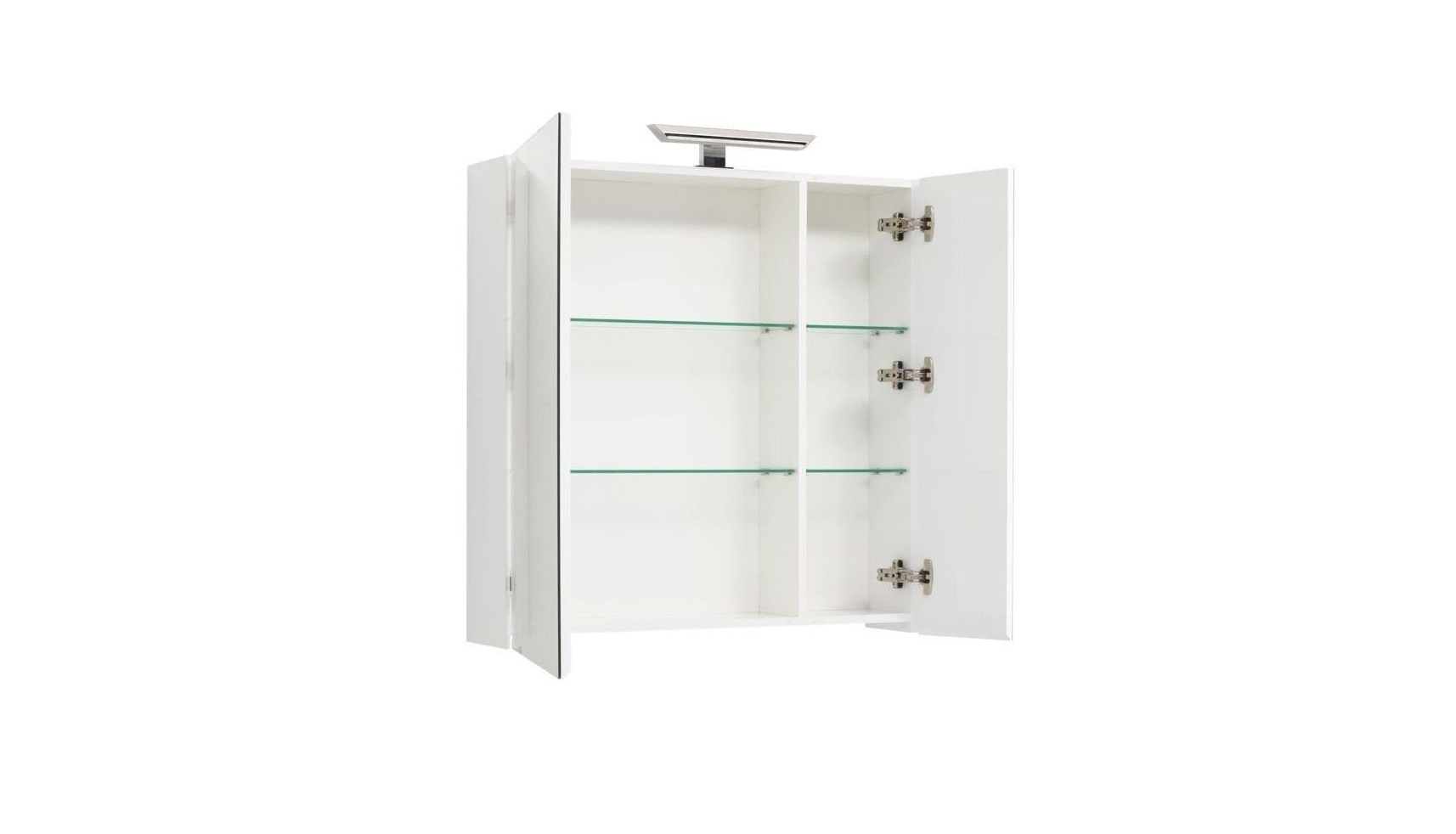 Внутри оборудована зона хранения со стеклянными полочками, скрытыми за двумя распашными зеркальными дверками.