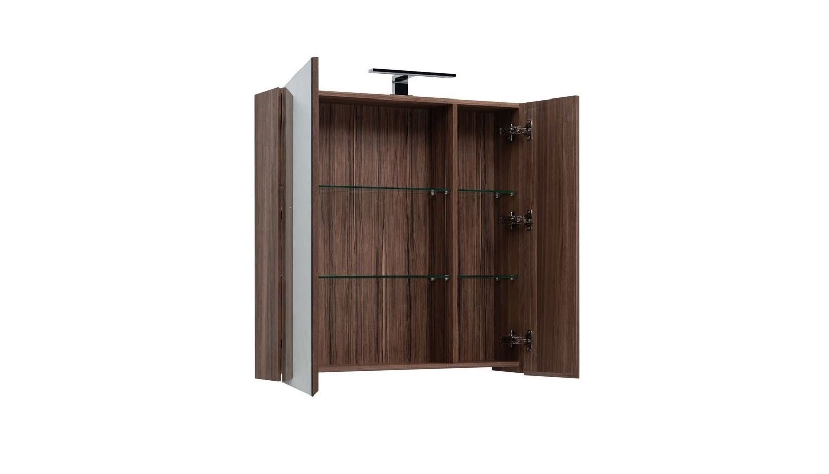 Зоны хранения в шкафчике шириной 85 см распределены по полочкам, скрытым за двумя фасадами, на которых закреплены зеркальные полотна, предназначенные для использования во влажных помещениях.