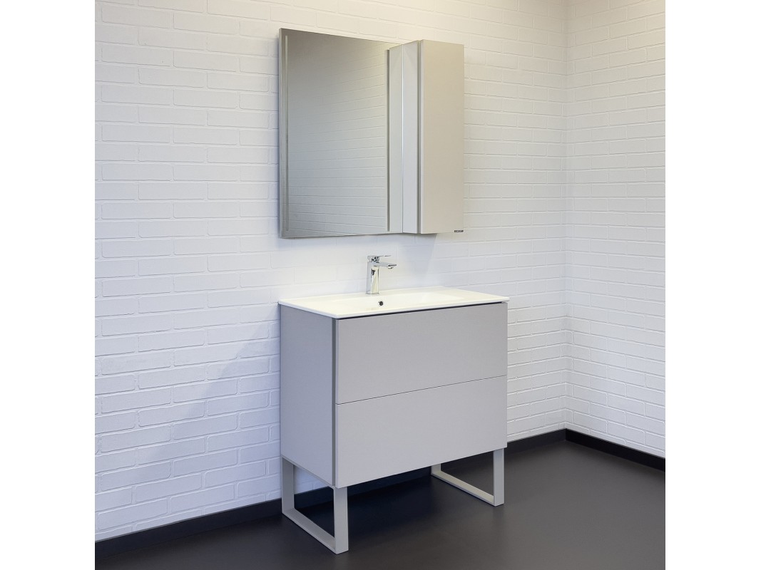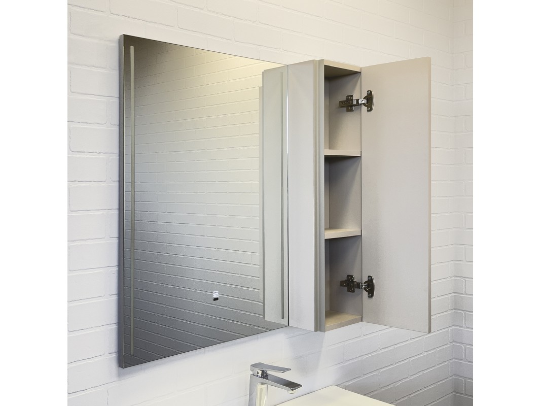 Зеркальное высококачественное полотно с амальгамой на основе серебра. Створка оснащена петлями с системой плавного закрывания. За створкой две полки. Открытие створки производится при помощи вертикальной профильной ручки интегрированной в левую боковую стенку шкафчика. Зеркало оборудовано фронтальной LED подсветкой с бесконтактным выключателем со встроенной функцией регулировки яркости. Температура подсветки 6000-6500K холодный свет. Зеркало-шкаф выпускается только с правым размещением мебельного элемента