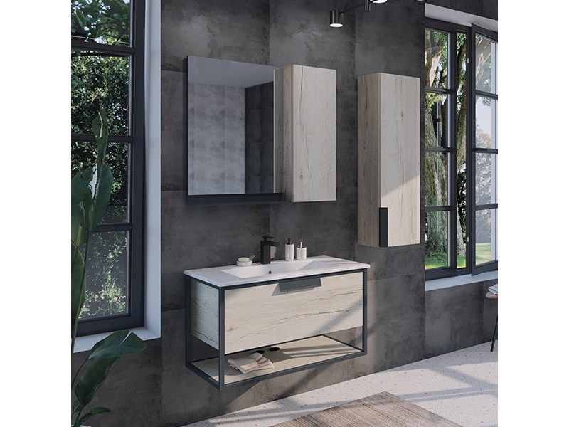 Створка оснащена петлями с механизмом плавного закрывания. Высококачественное зеркальное полотно с амальгамой на основе серебра. Фасад и корпус из влагостойкого ЛДСП Дуб дымчатый. За створкой одна горизонтальная полка. Под зеркалом расположена металлическая полочка окрашенная в цвет графит матовый для размещения предметов для умывания.