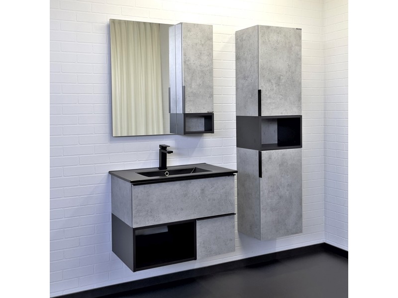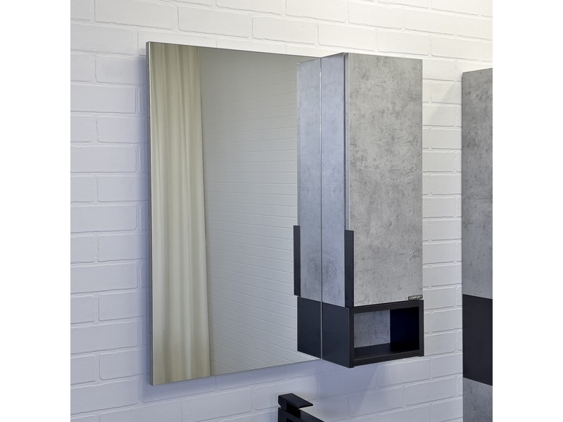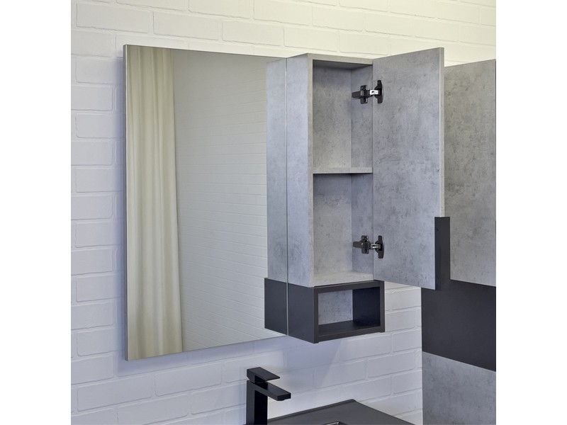 Высококачественное зеркальное полотно с амальгамой на основе серебра. Боковой шкаф из влагостойкого ЛДСП с декором бетон светлый.