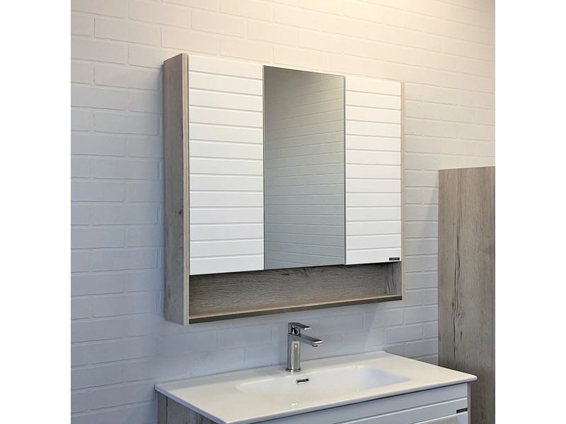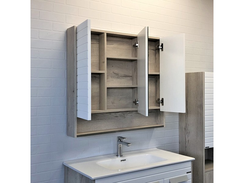 Створки оснащены петлями с плавным закрыванием. Высококачественное зеркальное полотно с амальгамой на основе серебра. Обе боковые створки открываются наружу. У центральной створки петли справа. За центральной зеркальной створкой две горизонтальные полки, за боковыми по одной. На нижней внешней полке можно расположить невысокие принадлежности для умывания.