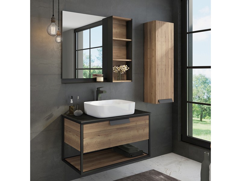 Створка оснащена петлями с механизмом плавного закрывания. Высококачественное зеркальное полотно с амальгамой на основе серебра. Фасад и корпус из влагостойкого ЛДСП Дуб темный. За створкой одна горизонтальная полка. Под зеркалом расположена металлическая полочка для размещения предметов для умывания.
