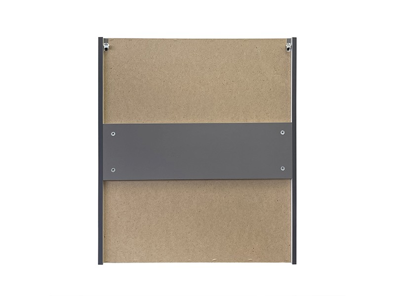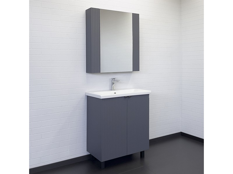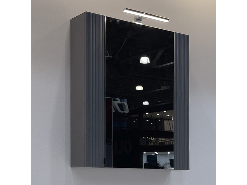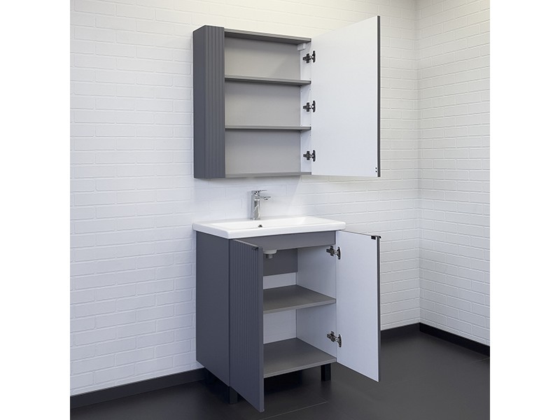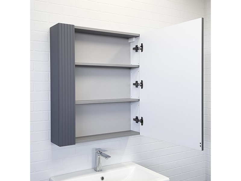 Зеркальное высококачественное полотно с амальгамой на основе серебра. Створка декорирована вертикальной фрезеровкой и оснащена петлями плавного закрывания. За створкой две полки. В модели применяется плёнка с эффектом Soft-Touch.