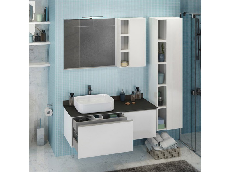 Дополнительно оснащается светильником. Фасад выкрашен белой глянцевой эмалью. Мебельный элемент из влагостойкого ЛДСП.