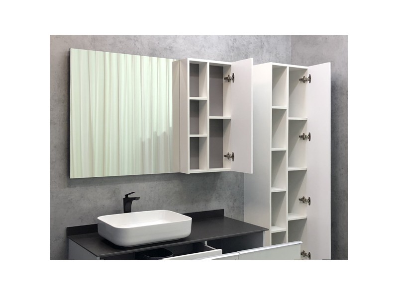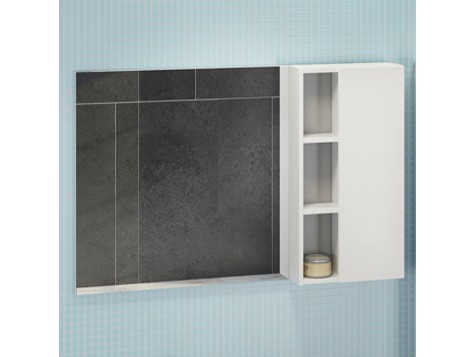 Зеркало-шкаф с одной створкой и пространствами для открытого хранения. Створка оснащена системой плавного закрывания. За створкой, одна горизонтальная полка. Высококачественное зеркальное полотно с амальгамой на основе серебра.