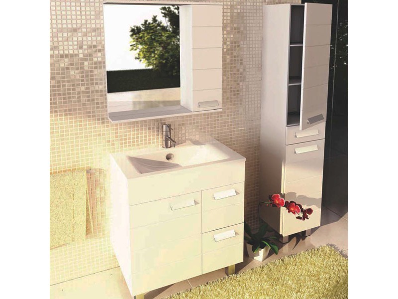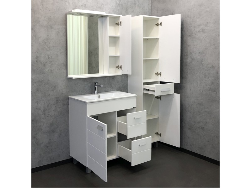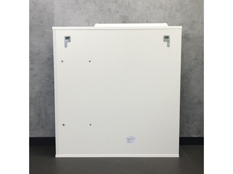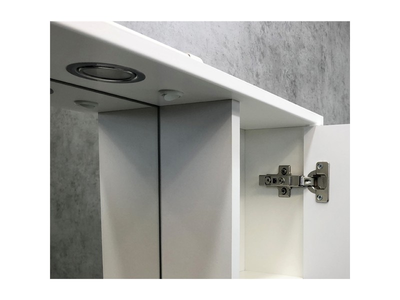 Створка оснащена петлями с плавным закрыванием. Высококачественное зеркальное полотно с амальгамой на основе серебра. Полки и створка покрыты белой матовой эмалью. Оснащается двумя точечными светильниками.