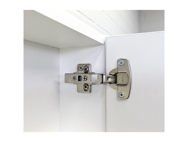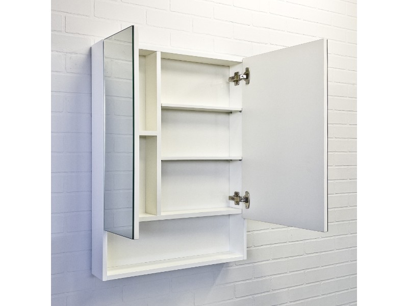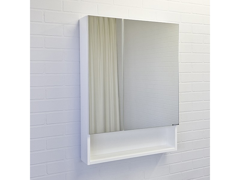 Створки оснащены петлями с плавным закрыванием. Высококачественное зеркальное полотно с амальгамой на основе серебра. Обе боковые створки зеркала открываются наружу. За широкой створкой две горизонтальные полки, за узкой одна. На нижней внешней полке можно расположить невысокие принадлежности для умывания.