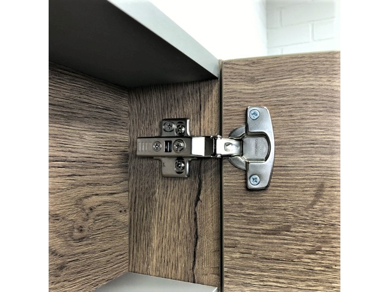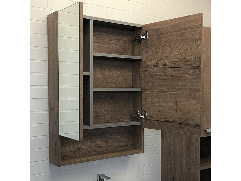Створки оснащены петлями с плавным закрыванием. Высококачественное зеркальное полотно с амальгамой на основе серебра. Обе боковые створки зеркала открываются наружу. За широкой створкой две горизонтальные полки, за узкой одна. На нижней внешней полке можно расположить невысокие принадлежности для умывания.