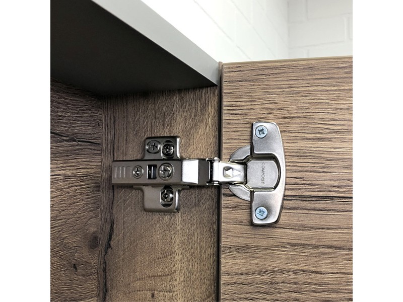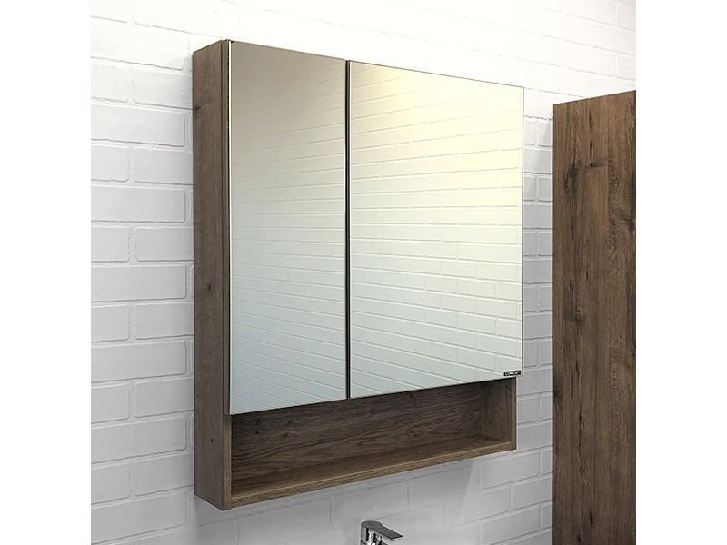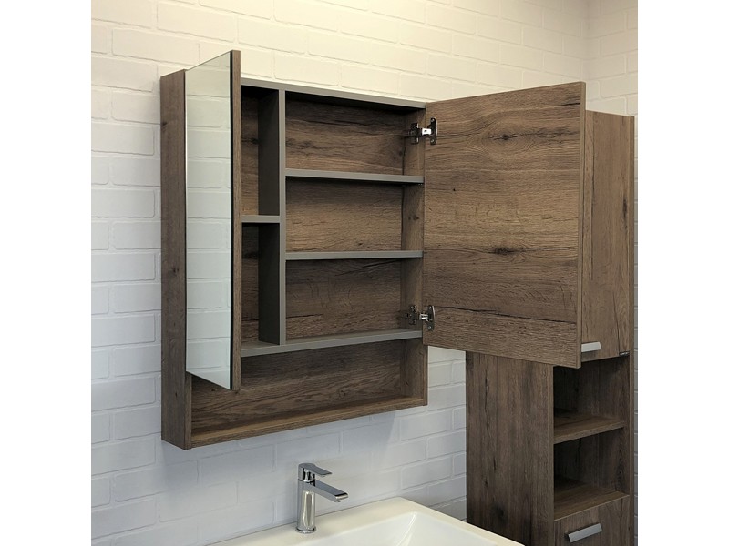 Створки оснащены петлями с плавным закрыванием. Высококачественное зеркальное полотно с амальгамой на основе серебра. Обе боковые створки зеркала открываются наружу. За широкой створкой две горизонтальные полки, за узкой одна. На нижней внешней полке можно расположить невысокие принадлежности для умывания.