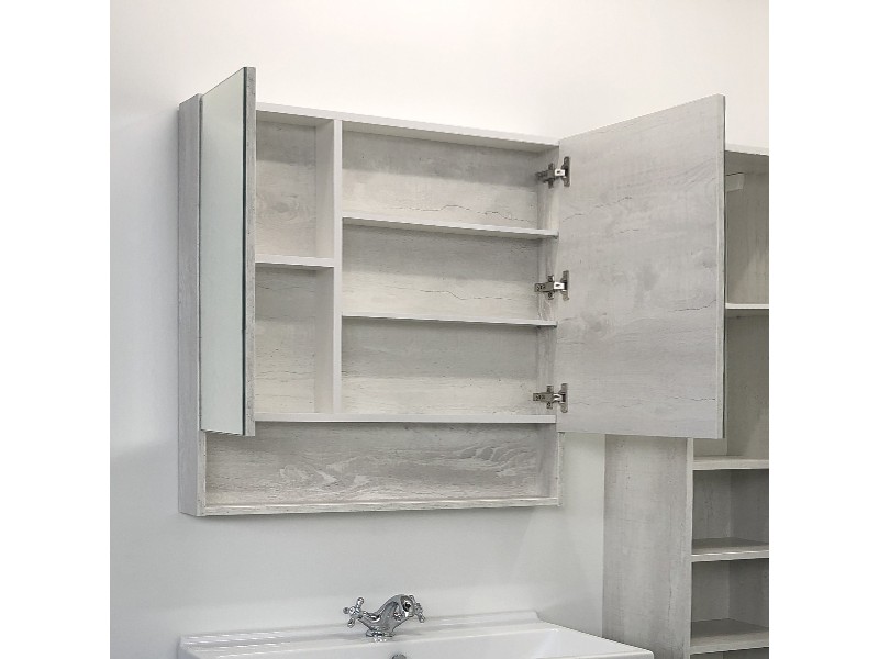 Створки оснащены петлями с плавным закрыванием. Высококачественное зеркальное полотно с амальгамой на основе серебра. Обе боковые створки зеркала открываются наружу. За широкой створкой две горизонтальные полки, за узкой одна. На нижней внешней полке можно расположить невысокие принадлежности для умывания.