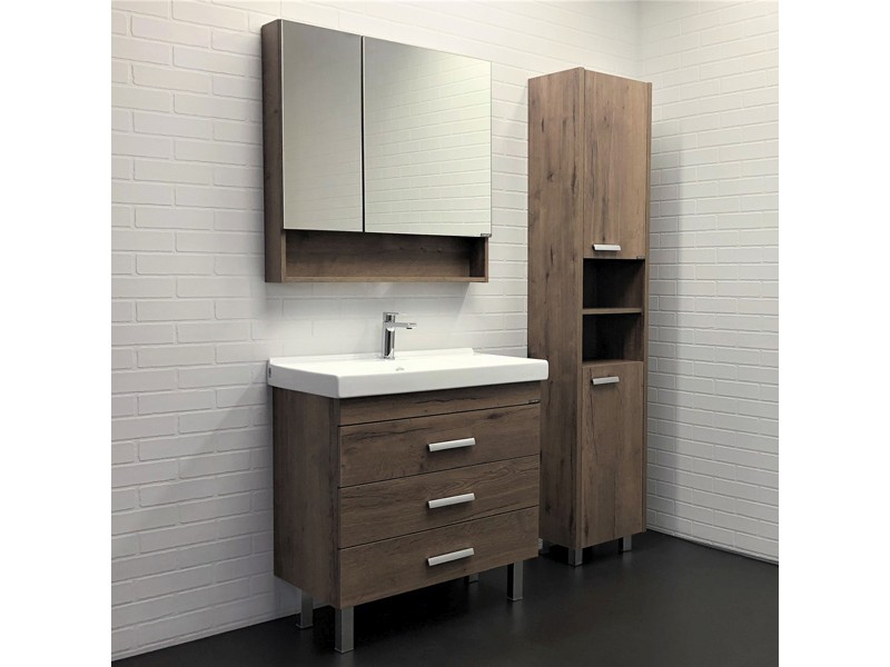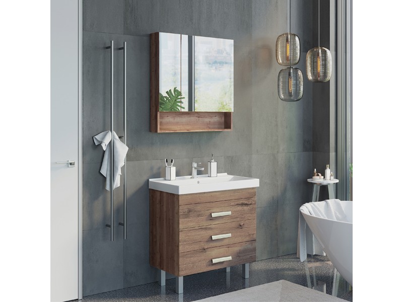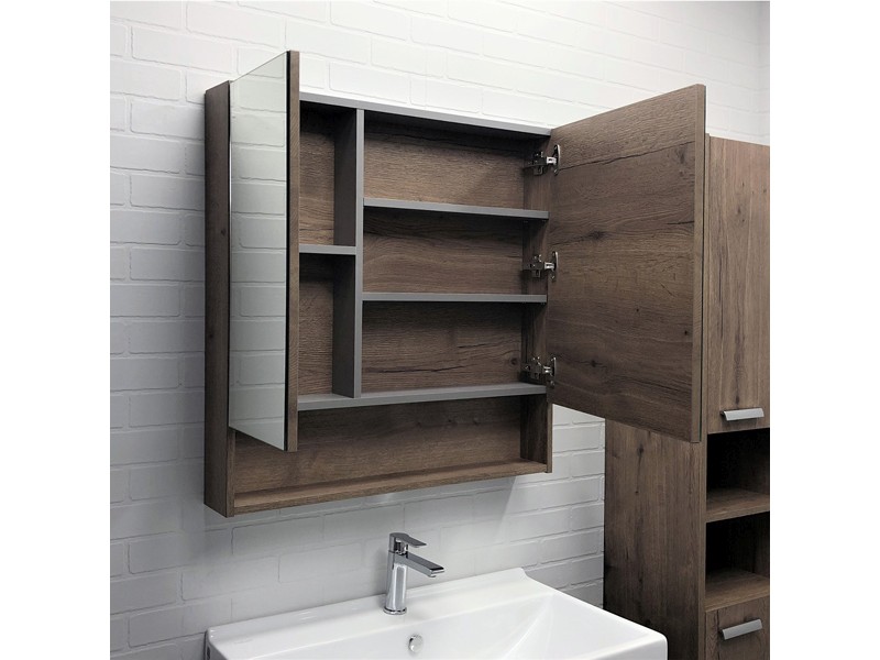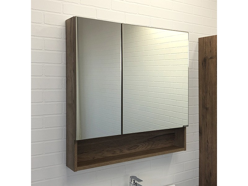 Створки оснащены петлями с плавным закрыванием. Высококачественное зеркальное полотно с амальгамой на основе серебра. Обе боковые створки зеркала открываются наружу. За широкой створкой две горизонтальные полки, за узкой одна. На нижней внешней полке можно расположить невысокие принадлежности для умывания.