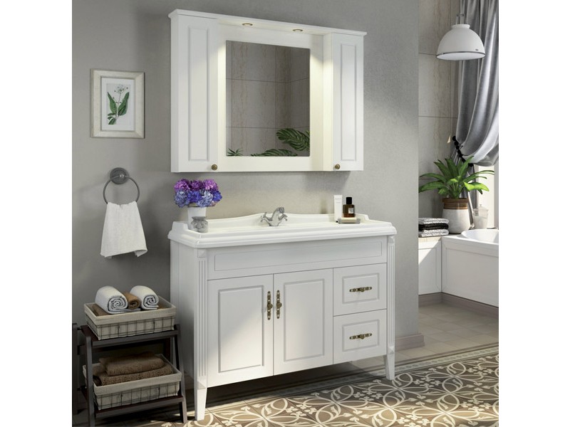 Зеркальное высококачественное полотно с амальгамой на основе серебра. Фасады мебельных элементов окрашены белой глянцевой эмалью и оснащены механизмами плавного закрывания. За створками по две полки. Верхний фриз оборудован двумя галогеновыми светильниками и выключателем.