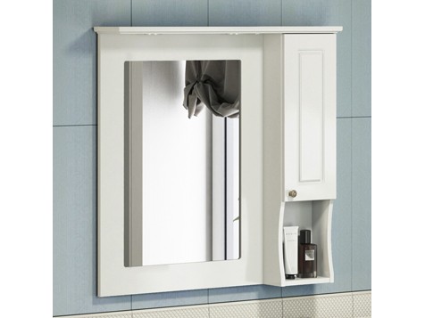 Зеркало-шкаф в стиле прованс с мебельным элементом справа. Рама зеркала и шкаф выполнены из МДФ и покрыты эмалью оттенка слоновая кость. Створка оборудована петлями с системой плавного закрывания. В верхней полке два галогеновых светильника. Высококачественное зеркальное полотно с амальгамой на основе серебра.