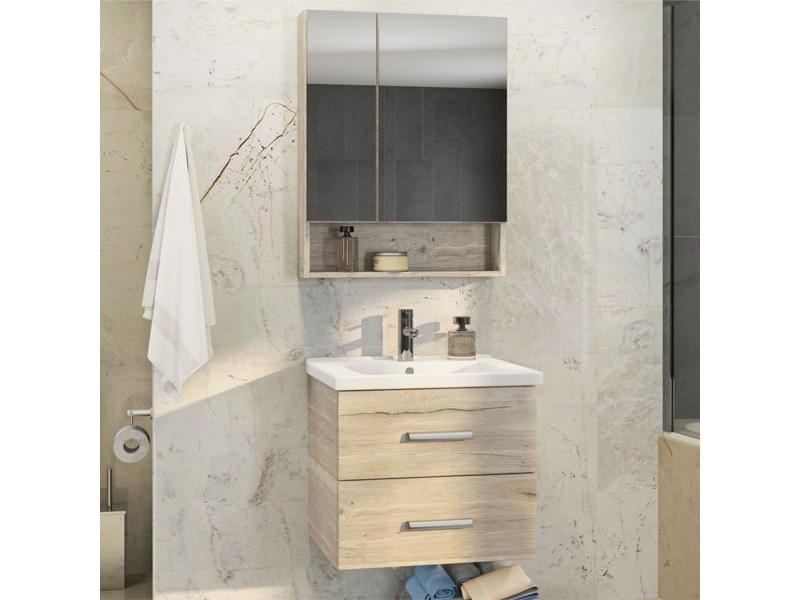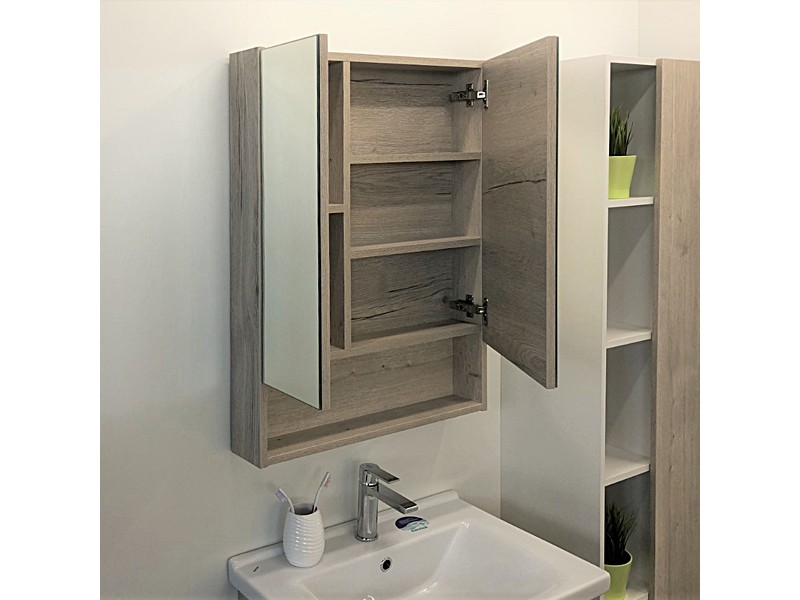 Створки оснащены петлями с плавным закрыванием. Высококачественное зеркальное полотно с амальгамой на основе серебра. Обе боковые створки зеркала открываются наружу. За широкой створкой две горизонтальные полки, за узкой одна. На нижней внешней полке можно расположить невысокие принадлежности для умывания.