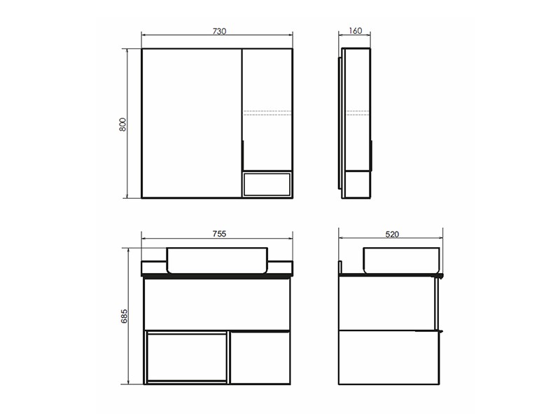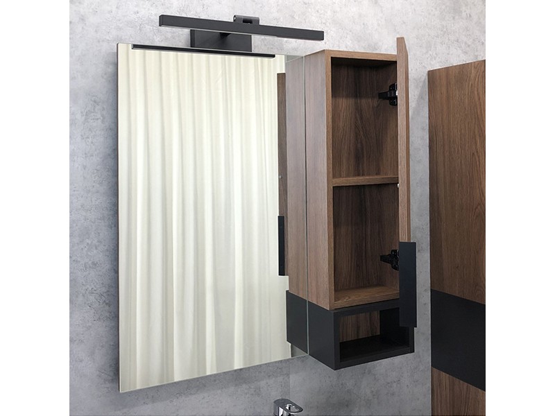 Створка оснащена системой плавного закрывания и черной матовой алюминиевой ручкой. Высококачественное зеркальное полотно с амальгамой на основе серебра. Фасад и корпус из влагостойкого ЛДСП дуб темно-коричневый. За створкой одна горизонтальная полка.